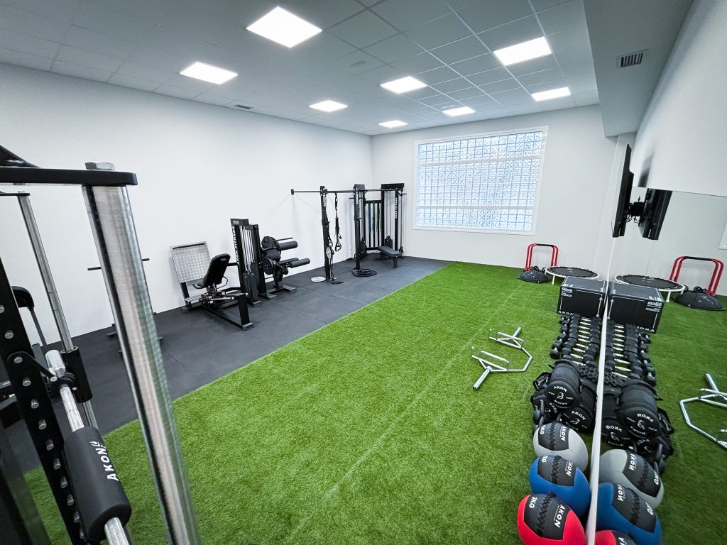 Equipada con prensa horizontal, máquina de extensión e curl de isquios, rack con pesos libres, landmine e dobre polea en “V”.